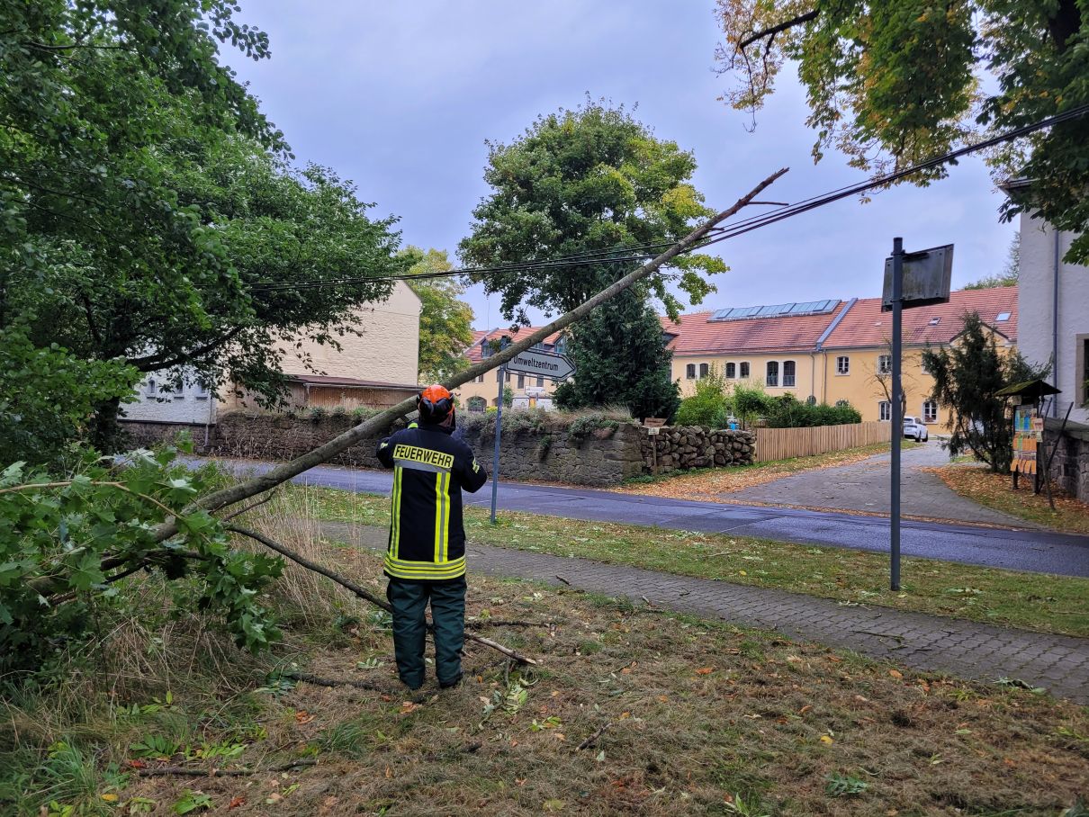 TH-1 - Baum in Telefonleitung - 04.10.2025 Nummer: 25 Datum: 04.10.2025 Uhrzeit: 15:38 Art: Fehlalarm Ort: Berlauterbach, Treuener Straße Anzahl eigene Kameraden: MLF: 1:2, Reserve: 1 Sonstige Kräfte: keine Kurzbeschreibung: Durch einen Sturm war ein kleiner Baum in eine Telefonleitung gefallen. Da dieser genau über dem Fußweg hing und eine Gefahr für die Öffentlichkeit darstelle beseitigten wir den Baum. Bilder/Berichte: