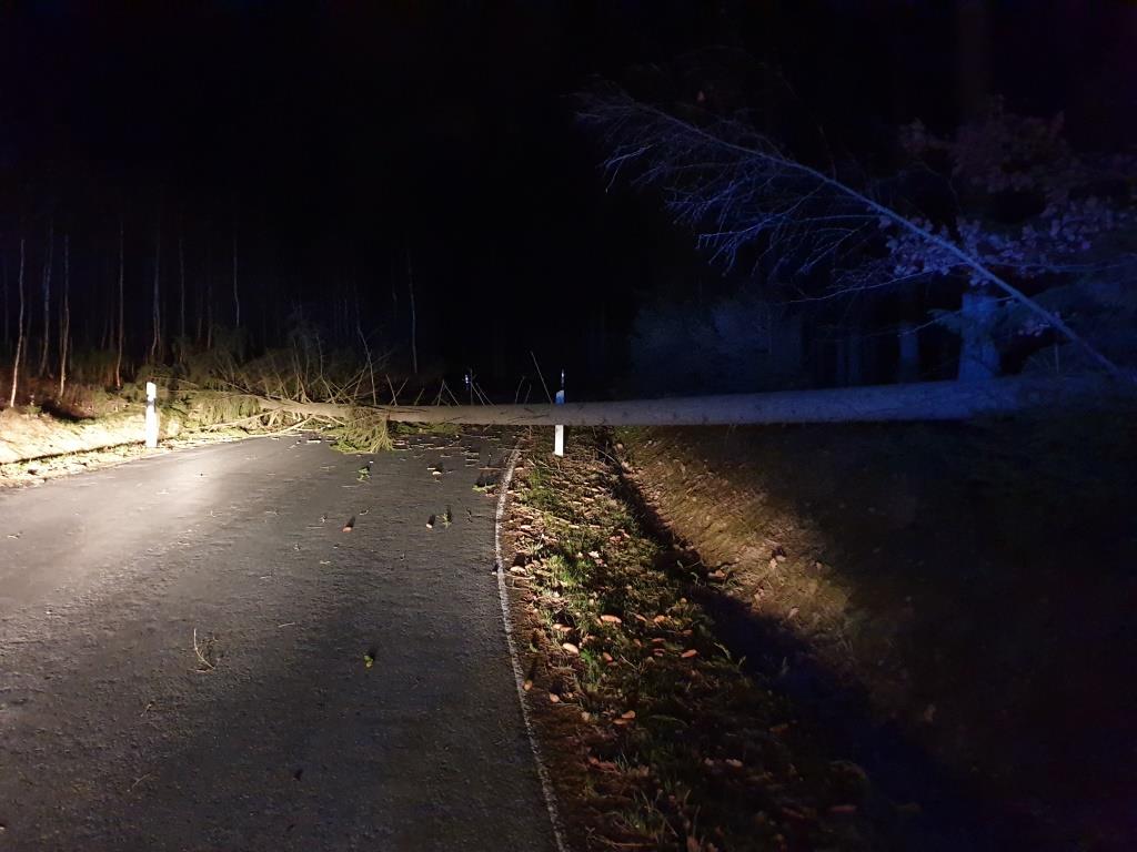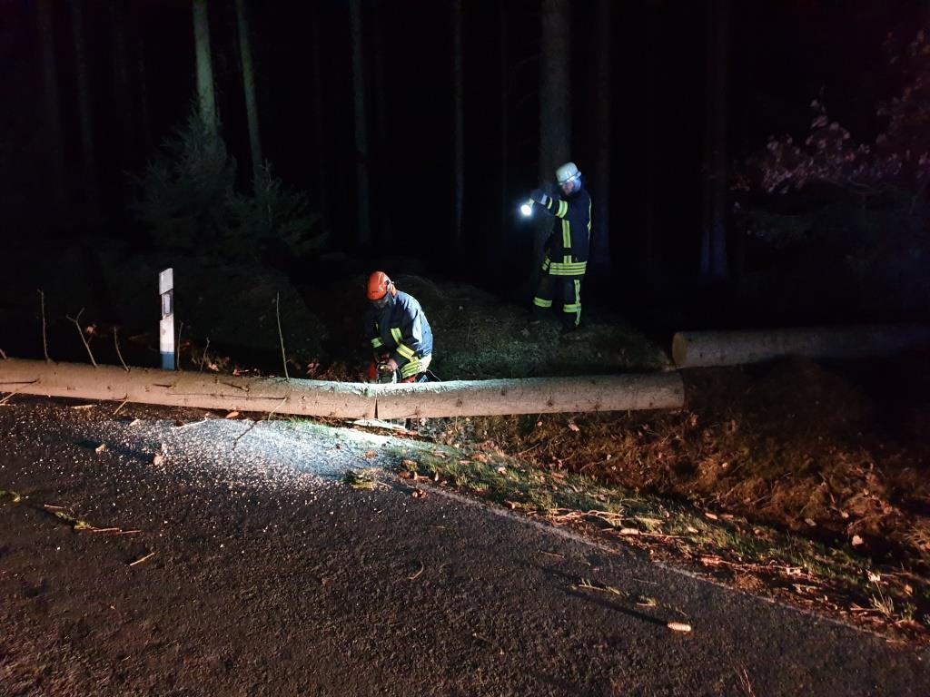 Zum dritten Sturmeinsatz innerhalb einer Woche wurden wir am Sonntagabend alarmiert. Eine große Fichte blockierte die Reumtengrüner Straße. Bei der Beseitigung war Eile geboten um nur möglichst kurz der Gefahr weiterer umstürzender Bäume ausgesetzt zu sein.